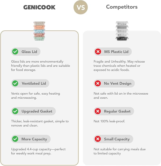 - Endure Extreme Temperatures & Lasting Clarity:Genicook Glass Food Storage Made From Ultra-Durable Borosilicate Glass, These Containers Are Built To Perform. They Seamlessly Transition From A Deep Freeze At -40°F Directly To A Hot Oven At 1040°F Without Warping Or Cracking. Plus, The Non-Porous Surface Resists Stains And Odors Forever, So Tomato Sauce Or Curry Won'T Leave A Trace, And Your Meal Prep Always Tastes Fresh.