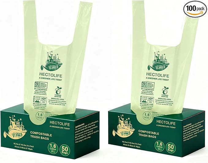 1.6 Gallon 100 Count,Compostable Bags Handle Tie,Tear Resistant Kitchen Food Scrap Waste Bag, ASTM D6400, US BPI and Europe OK Compost Home Certified