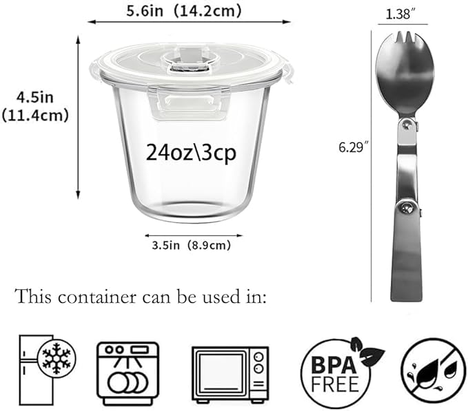 - Upgrade the lid: We have upgraded this 24oz round glass soup container with a built-in folding spoon on each lid, allowing you to easily enjoy delicious food anywhere, perfect for outdoor, school, office, gym meals