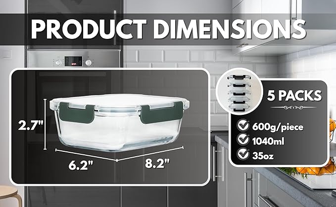 5-Pack Borosilicate Glass Food Containers 35oz, Airtight BPA-Free Meal Prep Containers with Locking Lids, Oven, Microwave & Dishwasher Safe Storage Set