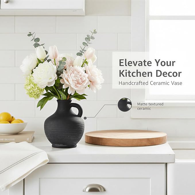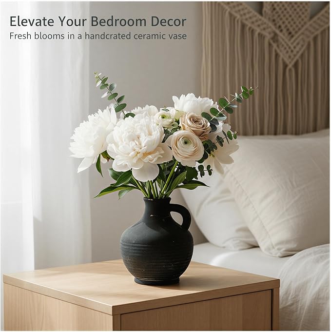 6-Inch Black Ceramic Flower Vase with Handles, Rustic Farmhouse Boho Pottery Centerpiece for Table, Living Room, Shelf & Mantel
