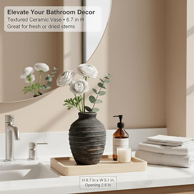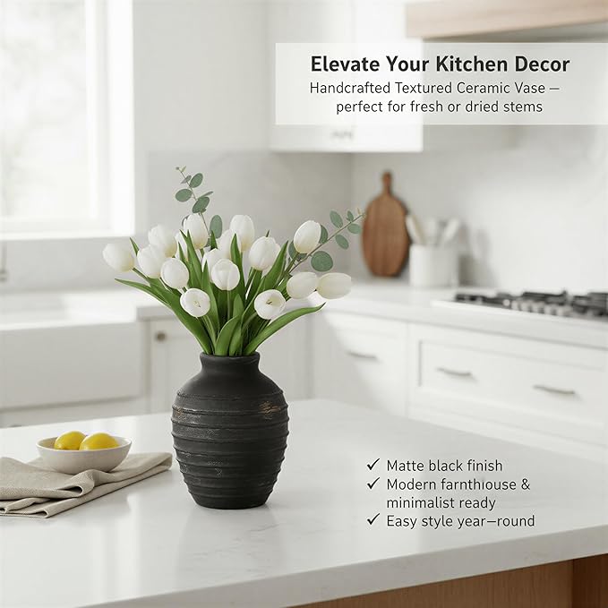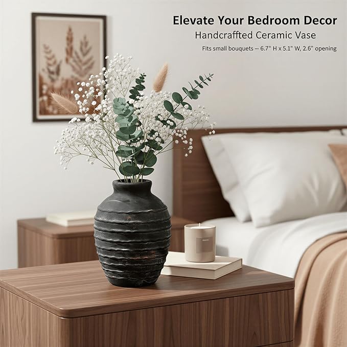 6.6-Inch Black Ceramic Flower Vase, Rustic Farmhouse Boho Pottery Decor for Table, Living Room & Shelf