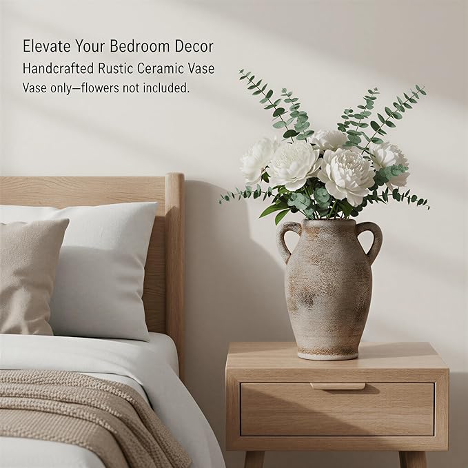 8.1-Inch Terracotta Ceramic Flower Vase with Handles, Rustic Farmhouse Boho Pottery Centerpiece for Table, Living Room & Shelf