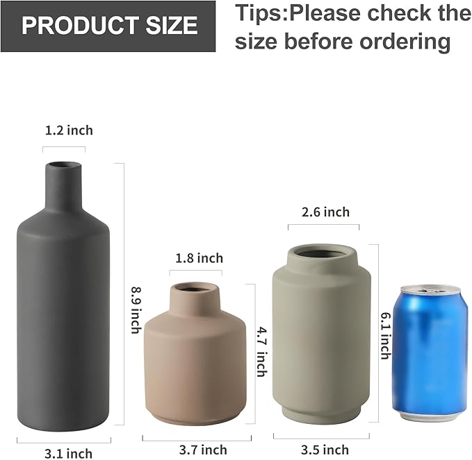 - 【Size of 3-piece Ceramic Vase Set】The ceramic flower vase set of 3 includes three different sizes: 3.15" W x 8.9" H, 3.5" W x 6.1" H, and 3.7" W x 4.9" H.