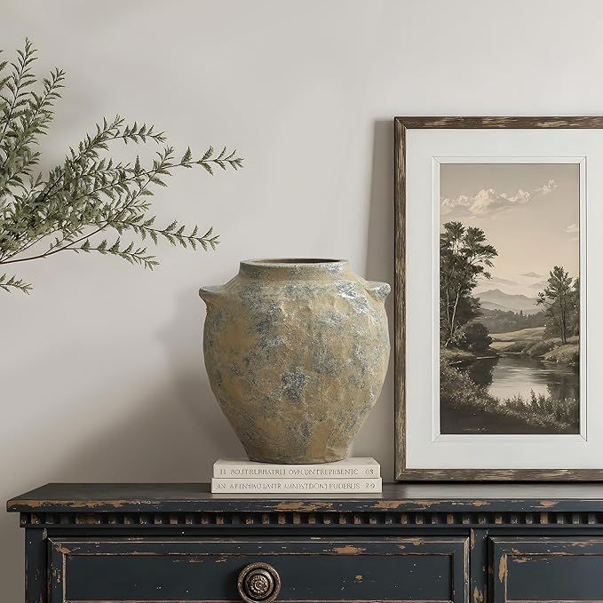 - Rustic Old-World Style: Handcrafted terracotta vase with side handles and layered brown-gray tones, bringing vintage elegance and rustic charm to modern or farmhouse interiors.