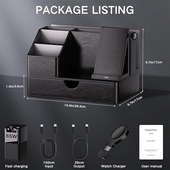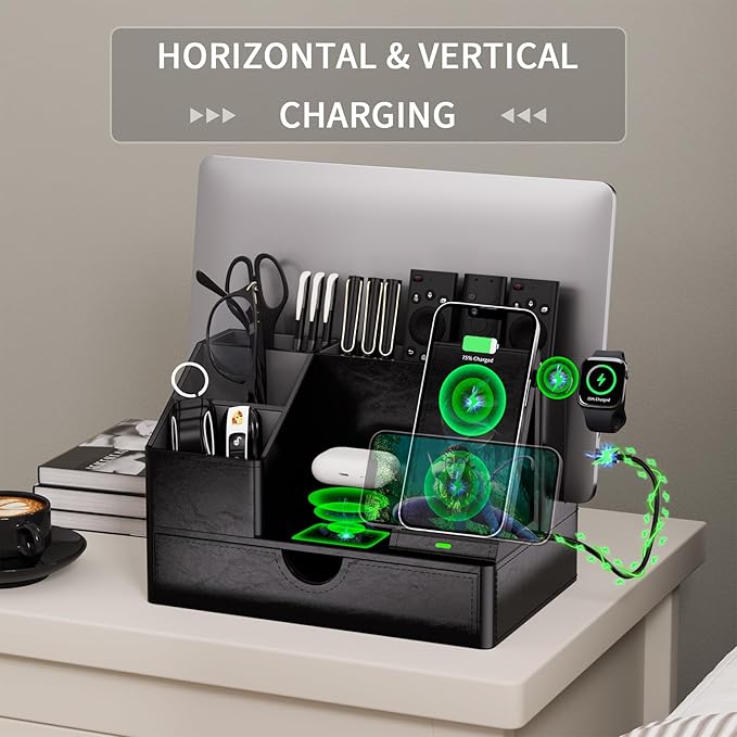 - 【ALL-IN-ONE CHARGING & ORGANIZATION SOLUTION】 Tame the cable chaos! This versatile charging station is designed to charge and organize all your electronic devices simultaneously – including phones, iPads, tablets, laptops, smartwatches, and wireless headphones. The spacious drawer and top shelf efficiently store remote controls, pens, scissors, glasses, sticky notes, wallets, and more, transforming your cluttered desk into a tidy workspace.