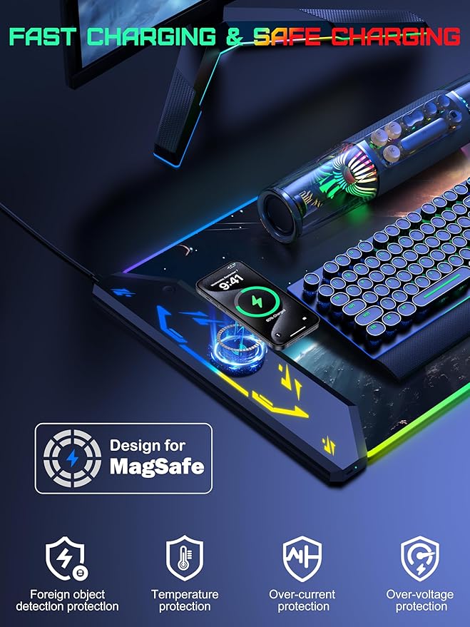 - 【Extra Large XXXL 5-IN-1 Wireless Charging Mouse Pad for Desk】 TopMade newest extended mousepad is 35.4" x 15.8", the extra large usable area covers your desk keyboard, mouse, and other items while gaming or working, and combines 5 functions of phone charging, AirPods charging, cool RGB light, desktop protector and mouse pad in one, allowing you to charge your iPhone or AirPods while using the gaming mousepad without the need for additional cables interfering with your desk, keeping your desk neat and tidy