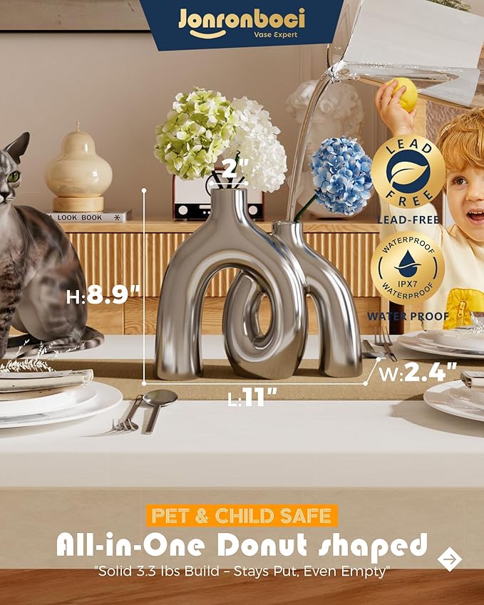 Hug Donut Decorative Vase Set - Silver Vase, Modern Nordic Boho Style Vases Home Decor, Matte Ceramic Decorations for Living Room Shelf, Bookshelf Mantle Entryway Table or Console Décor (Silver)