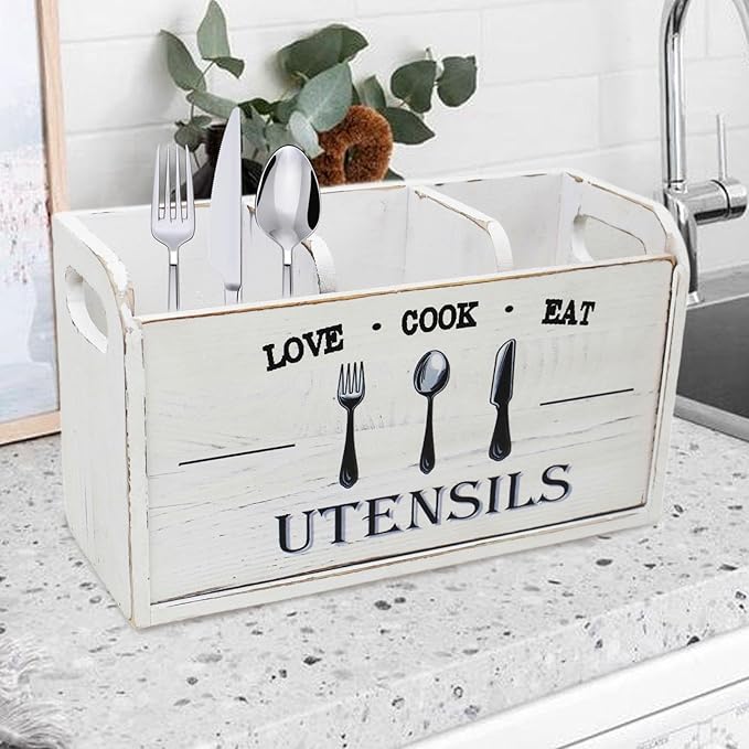 Fenteer Kitchen Utensil Holder Storage Crock Vintage Accessories Wooden Utensil Organizer Cutlery Box for Counter Hotels Restaurants, White