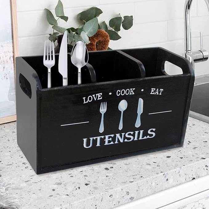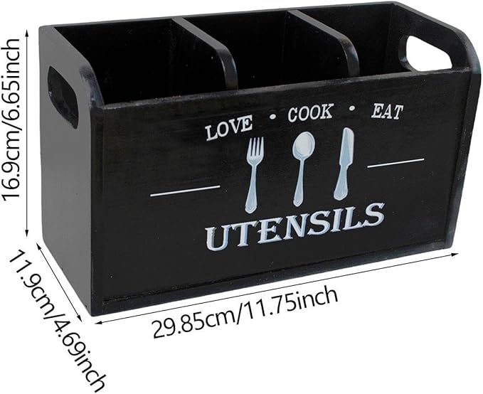 Fenteer Kitchen Utensil Holder Storage Crock Vintage Accessories Wooden Utensil Organizer Cutlery Box for Counter Hotels Restaurants, Black