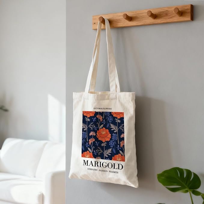 Flower Canvas Tote Bag, October Marigold Reusable Shoulder Bags, Christmas Gifts to Sister and Friends, Holiday Gift Bags for Wrap Storage, Casual Canvas Totes for Work Traveling