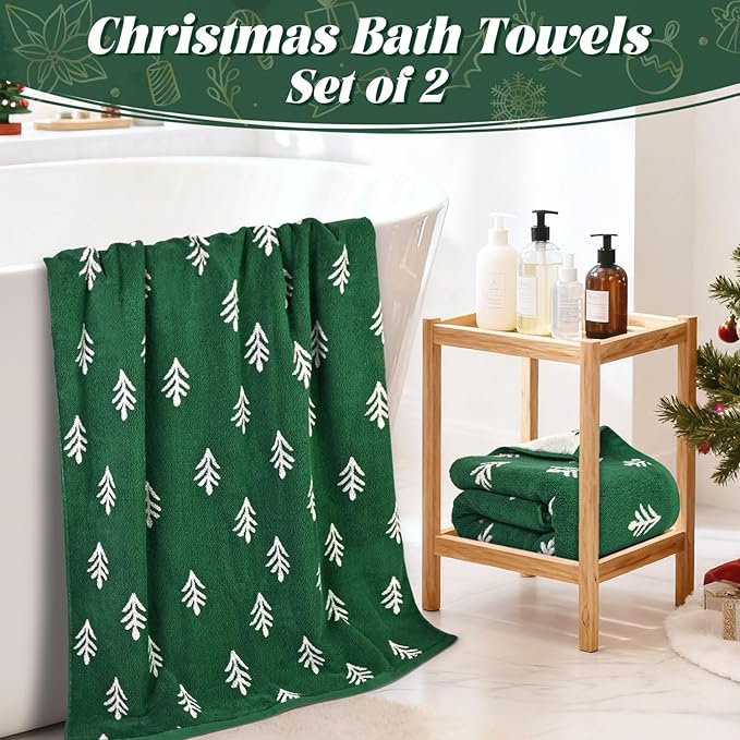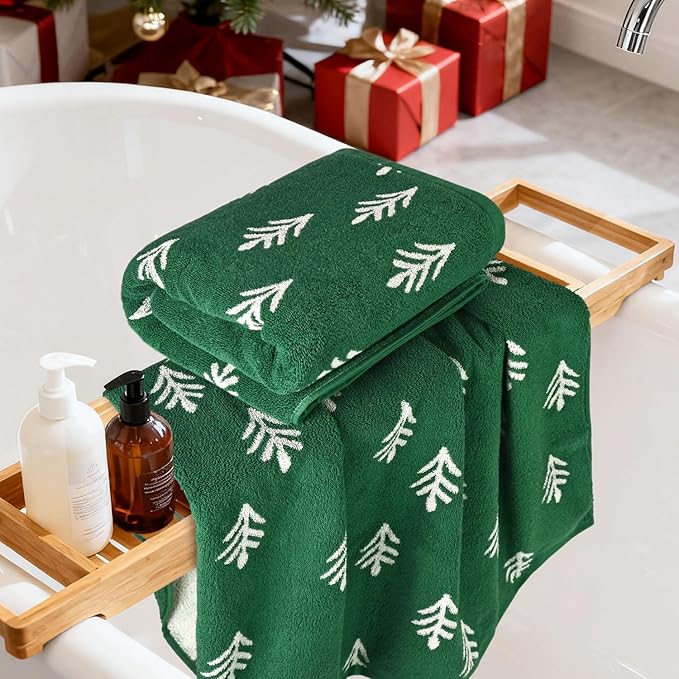 - Double-Sided Tree Pattern: Set of 2 forest green Christmas bath towels with reversible Xmas tree prints bring cozy festive warmth to your bathroom decor or shower routine. A cheerful way to celebrate the season with a stylish touch