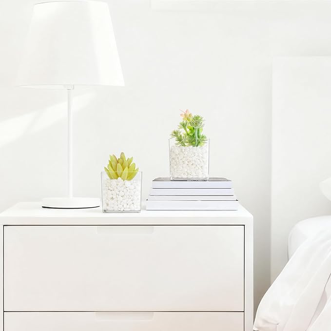 - Premium Acrylic Pot Design: This set includes two 2.36in clear acrylic cube pots. Acrylic is lightweight, durable, and shatterproof. The transparent material allows the white pebbles inside to be clearly visible, making it ideal for humid environments or spaces where real plants wouldn't survive, such as the living room, office, or bathroom.