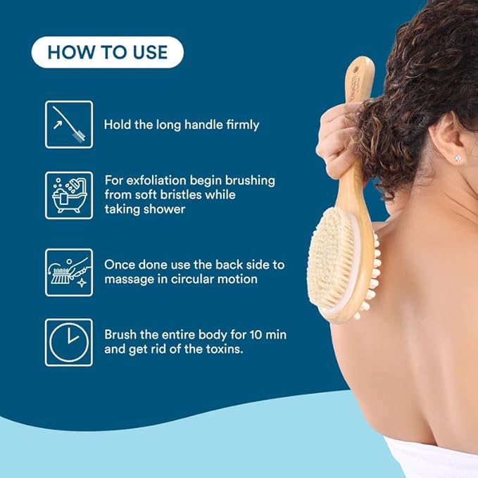 - DUAL-SIDED DESIGN This dual-sided brush has natural and soft bristles for exfoliation on front, while the back side is made of premium qualtiy pine wood nodules for massage. Use it wet in the shower or dry for a lymphatic drainage body brush effect
