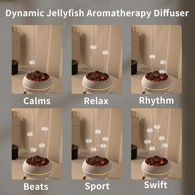 - 3. Sound-Activated Sync + Jellyfish-Inspired Visuals: Unlock Sensory Joy Double-tap the K2 Mode Button to activate the sound-responsive feature—mist rhythm and intensity adjust in real time with surrounding sounds. Equipped with unique jellyfish-shaped diffusion technology, it releases fine, non-dripping mist. Paired with synchronized lighting, the mist resembles a swimming jellyfish, delivering double the comfort for both sight and smell (covers up to 50㎡, filling a bedroom in just 10 minutes).