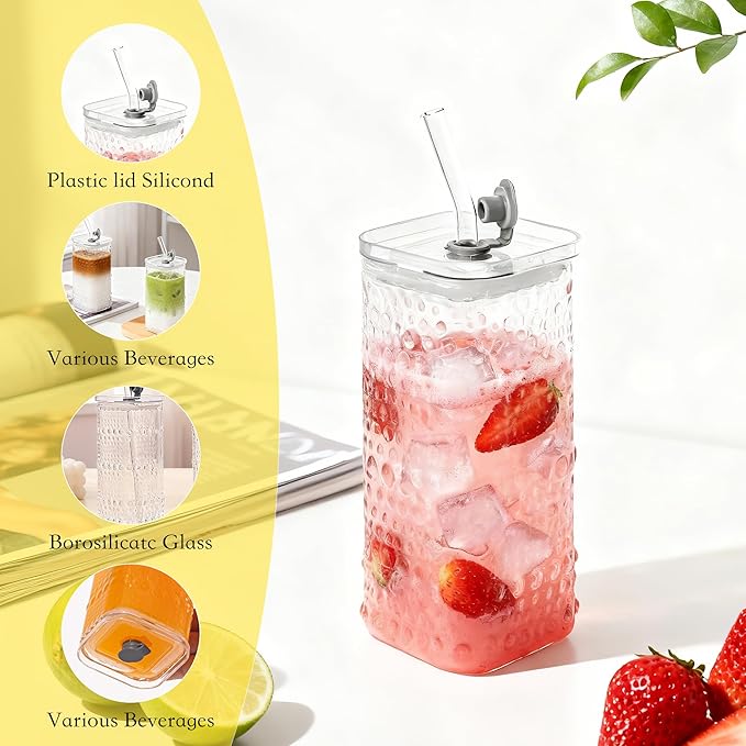 - Leak-Proof Lid for Mess-Free Usage: Enjoy complete peace of mind with our precision-engineered sealing lids that prevent spills and leaks. The airtight silicone seal locks in freshness while ensuring no liquid escapes when shaking or transporting drinks. Ideal for busy lifestyles, these square glass cups with lids are perfect for smoothies, iced coffee, and bubble tea on the go. The secure closure makes them excellent for outdoor gatherings, picnics, and car commutes without worrying about messy accidents