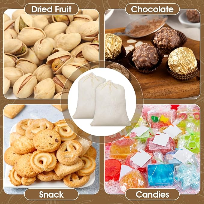 - 【Versatility & Usage】Suitable for a wide range of applications, these muslin bags can be used to store tea leaves, spices, coffee beans, handmade soaps, jewelry, and party favors. They also serve well as produce bags, craft pouches, or DIY gift bags. Their multi-purpose nature makes them a practical addition to kitchens, craft rooms, and event setups, supporting both everyday use and special occasions.