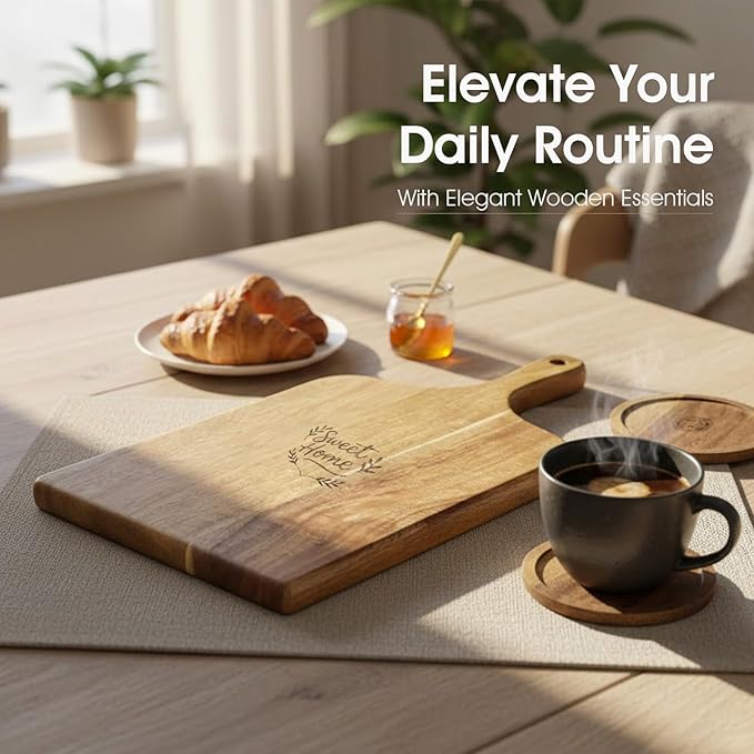 - 【Rustic Elegance, Built for Last】 Crafted from premium, natural acacia wood, each piece boasts a unique grain pattern, ensuring no two sets are alike. The board and coasters are not only scratch-resistant and durable for daily use but also serve as a beautiful, rustic centerpiece that elevates your kitchen and dining decor.
