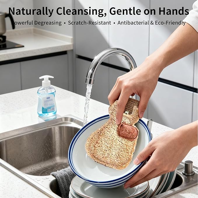 - 100% Biodegradable & Sustainable Made from natural loofah plant fibers. Fully decomposes after use, leaving zero environmental harm. Supports eco-friendly lifestyles and reduces plastic waste in kitchens.