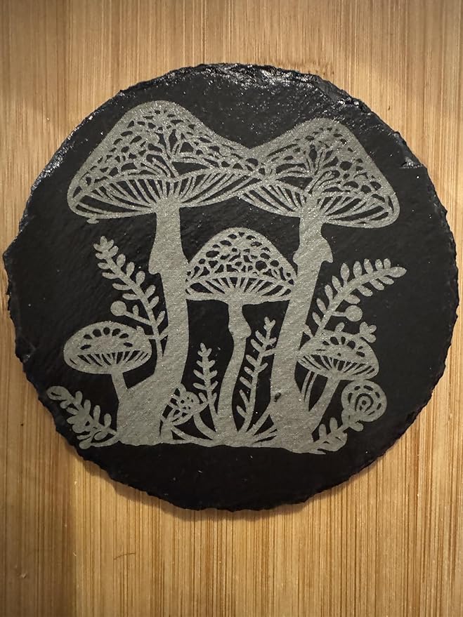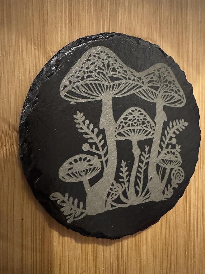 Mushroom Engraved Slate Coaster Set, Natural Stone with Butterfly and Floral Design, Round Shape, Set of 4