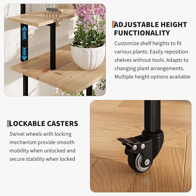3 Tier Rolling Plant Stand with Lockable Wheels, Adjustable Height Wooden Flower Shelf Indoor Outdoor, 200LB Capacity, Multi Purpose Tall Plant Stand for Home Garden